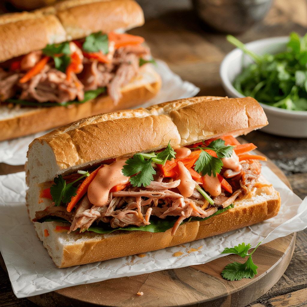 Lemongrass pork, pickled carrots & daikon, coriander, and sriracha mayo.