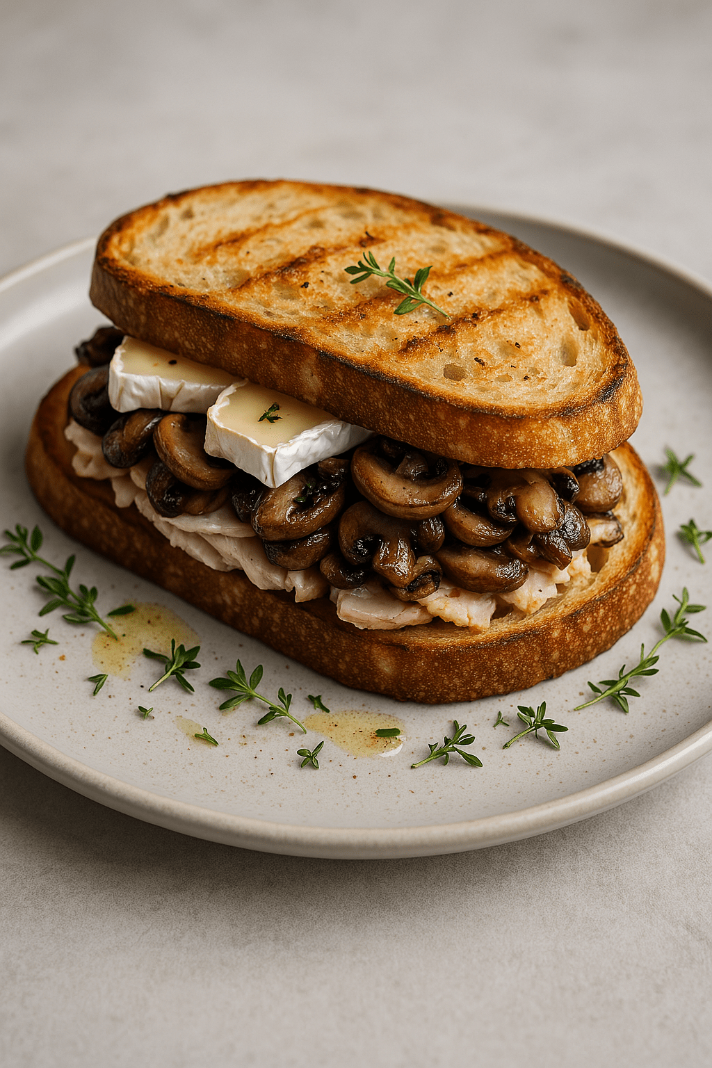 Turkey, garlic mushrooms, brie, thyme, and truffle oil.