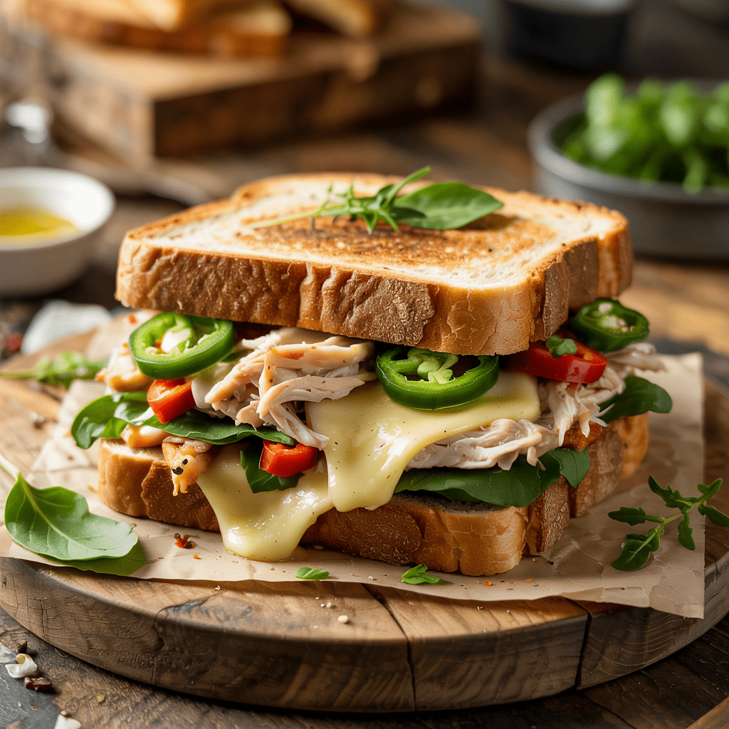 Pulled chicken, jalapeños, capsicum, rocket, and cheese blend.